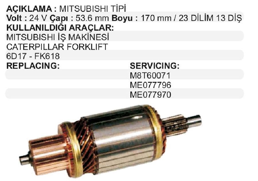 MARŞ KOLL. 24V KOBELCO İŞ MAKİNASI (MITSUBISHI MOTORLU) CATERPİLLAR FORKLİFT 6D17 - FK618 BOY:170 CAP:53,6 DIS:13 DILIM:23 RULMANSIZ REMA-IM3088