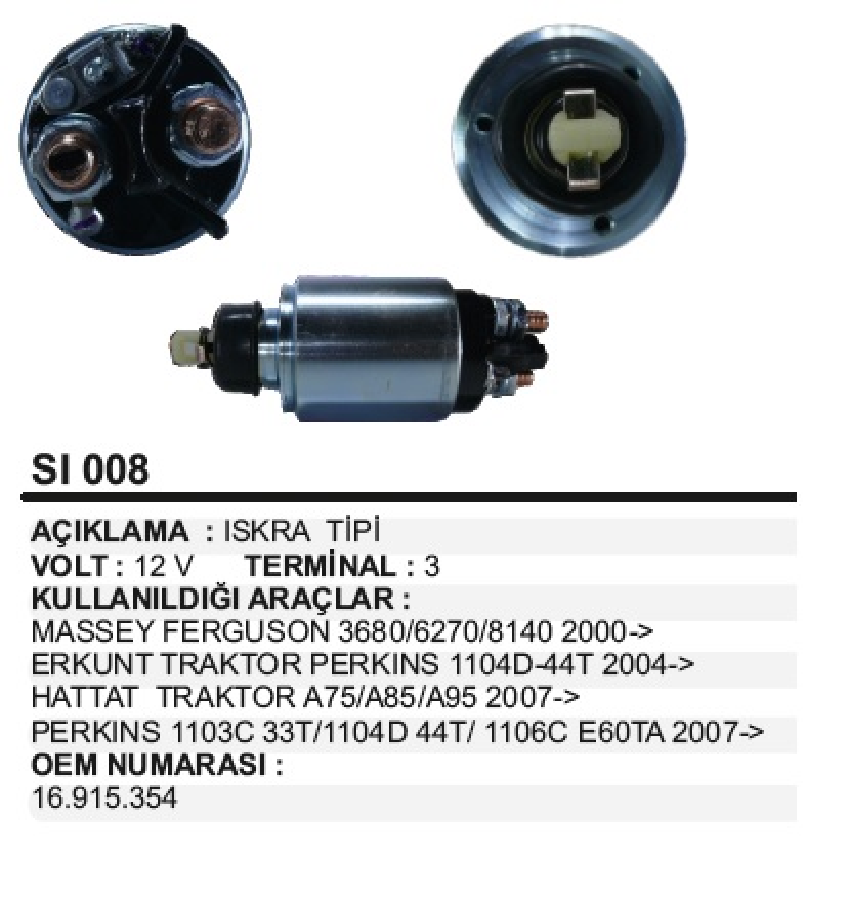 MARŞ OTOM.12V.ISKRA TİPİ MF 3680/6270/8140 2000-->NEW HOLAND/ERKUNT TRAKTÖR PERKİNS 1104D-44T 2004-->HATTAT TRAKTÖR A75/A85/A95 2007-->PERKİNS 1103C 337/1104D 44T/1106C E60TA 2007-->/( JCB ) STARTER UCU FISLI CİVATANIN BİRİ M10 BİRİ 8 REMA-SI008