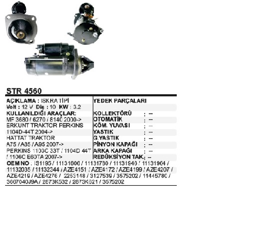 MARŞ MOTORU ISKRA TİPİ 12V 10D 3,2KW MF 3680/6270/8140 2000--> ERKUNT TRAKTÖR PERKINS TIPI 1104D-44T 2004-->HATTAT TRAKTÖR A75/A95 2007--> PERKİNS 1103C 33T/1104D 44T/1106C E60TA 2007--> JCB IS1195 REMA-STR4560