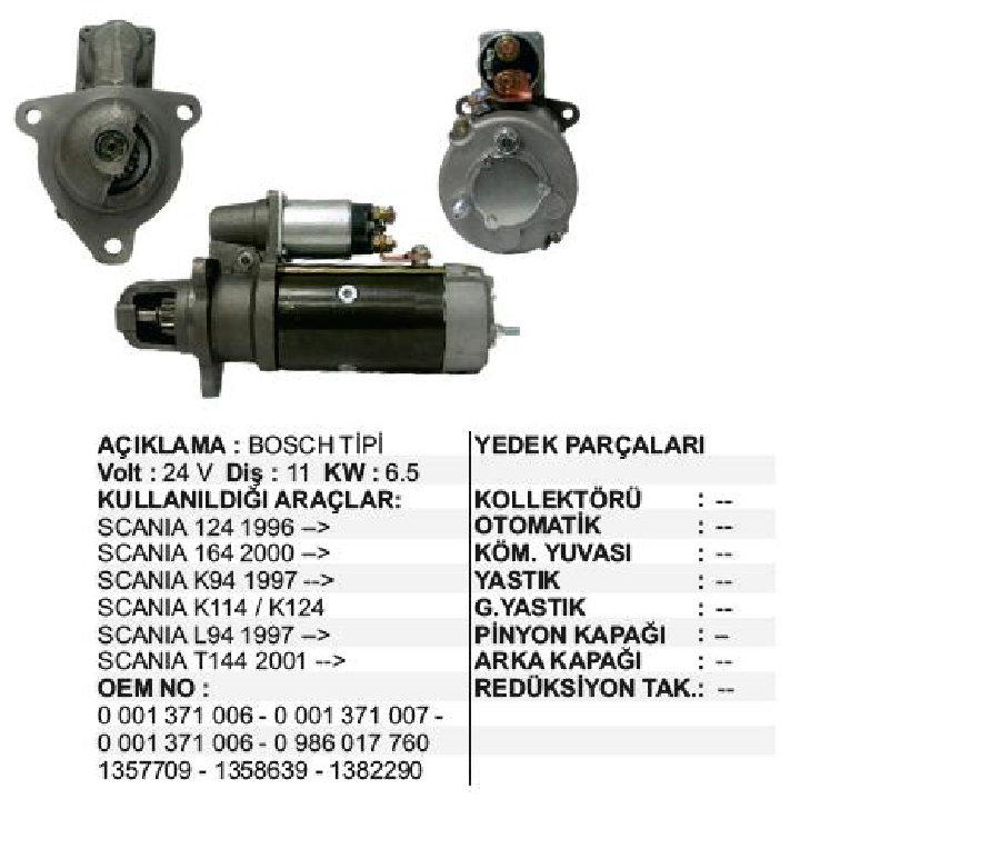 MARŞ MOTORU 24V.11D.6,5 KW BOSCH TİPİ SCANIA 124/164/T144/K124 1996> REMA-STR8037