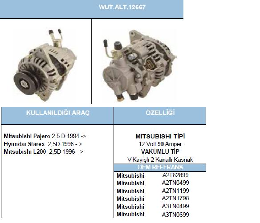 ALTER.12V.90A MİT.TİPİ DİNAMO1 STAREX L300 KLİMALI 2,5D TDİ 98-> YM ÇİFT KASNAK OVAL W ALT12667 WUT.1101.0065