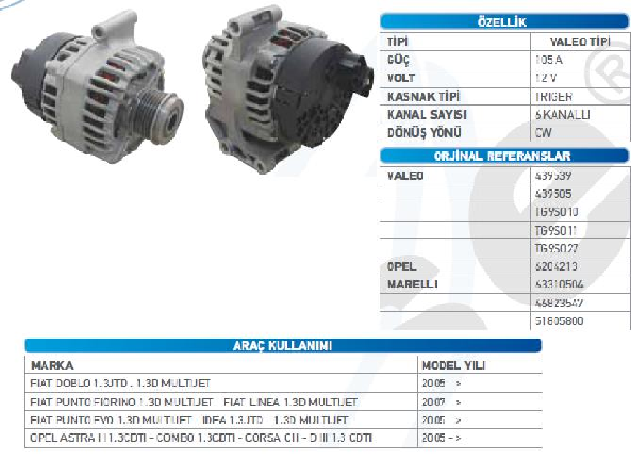 ALTER. 12V 105A VALEO TİPİ DİNAMO1 FIAT PUNTO EVO 1.3D - FİAT 500 1.3D MULTİ JET2007- W ALT22795 WUT.1101.0029