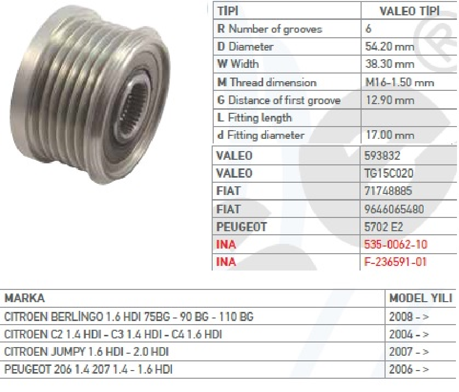 ALTER.KASNAK BİLYALI 6 KANAL CIT.BERLINGO 1,9D - 1,6HDİ - CITROEN C2 - C3 - C4 PARTNER 207/307 HDI /535006210 (F-236591.0 KSN94261 WUT.1102.0081