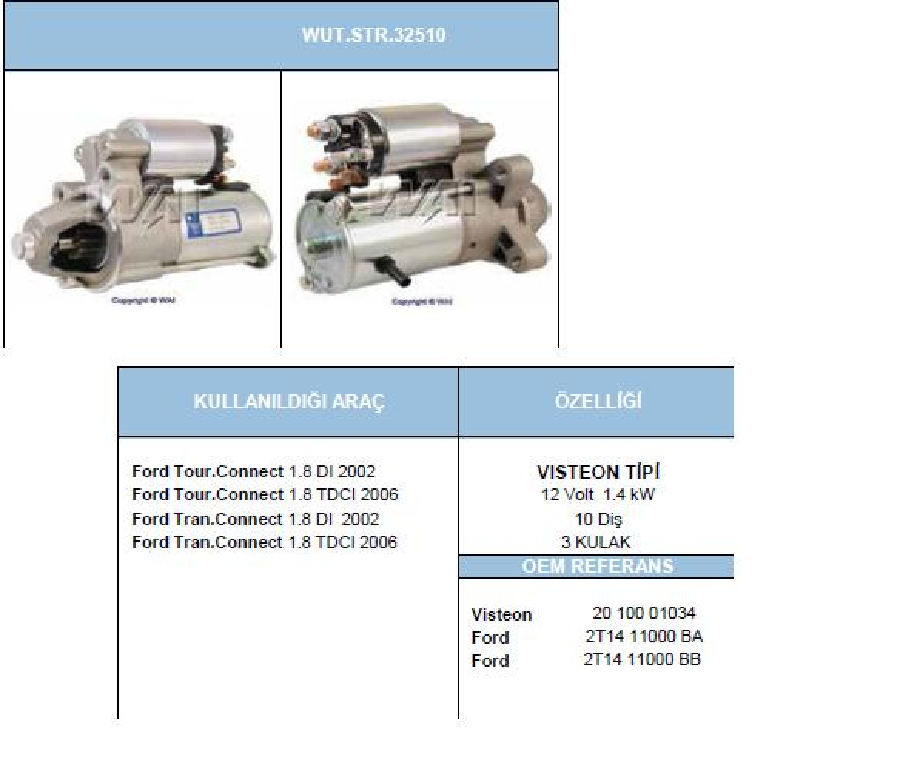MARŞ MOTORU 12.10D.1,4 KW VİSTEON TİPİ FORD CONNECT 1,6-1,9/FESTİVA IV 1,8TDİ STR32510 WUT.1107.0069