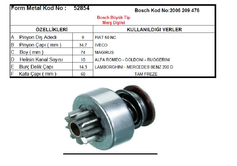 MARŞ DİŞLİSİ 9D BOSCH TİPİ (0366)ALFA ROMEO-MERCEDES 200D-IVECO 52854