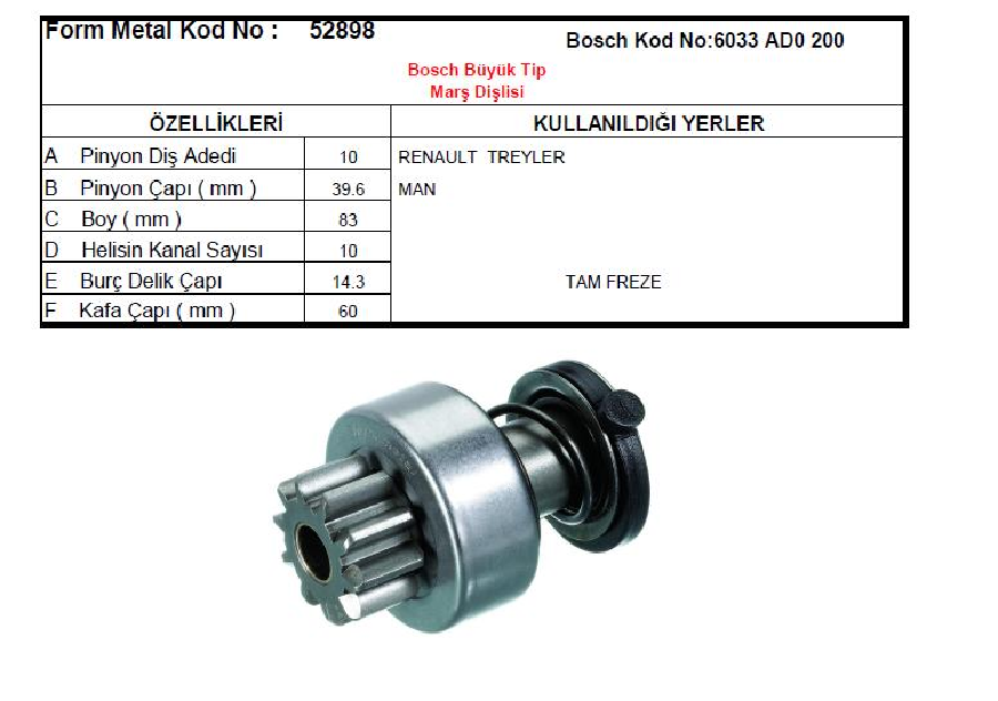 MARŞ DİŞLİSİ 10D>BOSCH TİPİ BMC PROFESYONEL OTOBÜS RENAULT TREYLER/MAN PERKİNS DODGE YM İVECO EURO CARGO 52898