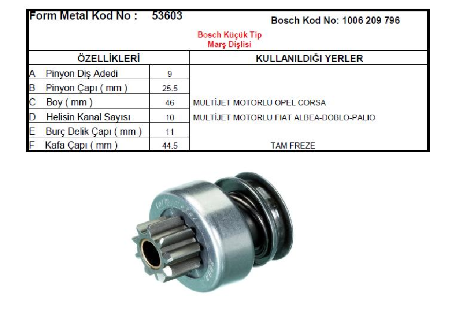 MARŞ DİŞLİSİ BOSCH TIPI 9 DIS 1006209796 MULTIJET MOTORLU FIAT DOBLO 1.3 JTD (05->)/OPEL CORSA C 1.3CDTI (05->)- OPEL COMBO 1.3CDTI (04->) (1641) 53603