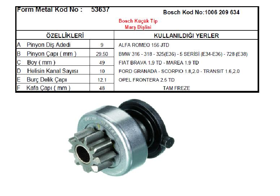 MARŞ DİŞLİSİ 9D BOSCH TİPİ ALFA ROMEO 156 JTD/BMW 316-318(E36) 5 SERİSİ (E34-E36)/FİAT BRAVA 1.9TD/MAREA 1.9TD/FORD GRANADA/SCORPİON 1.8-2.0/TRANSİT 1.6-2.0/OPEL FRONTERA/DOBLO 1.9 JTD 53637