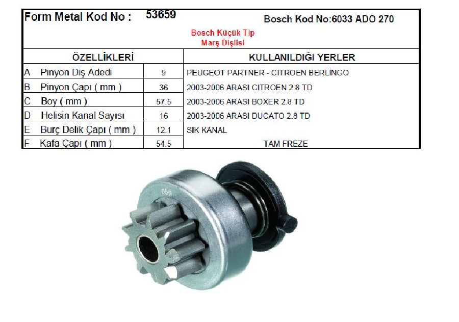 MARŞ DİŞLİSİ BOSCH TİP 9D-16K-SF>PEU.PARTNER/CITROEN BERLINGO SIK KANAL 53659