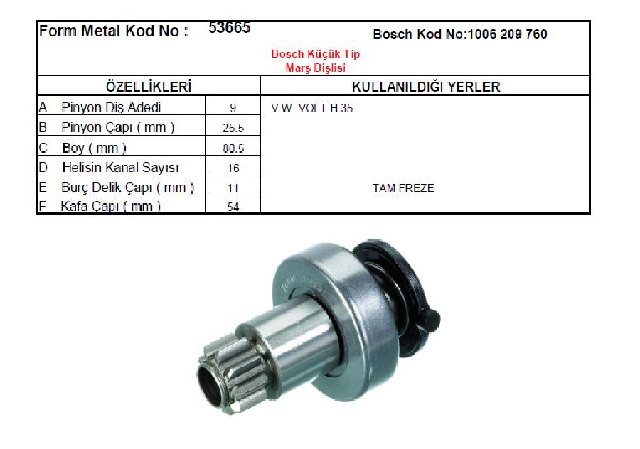 MARŞ DİŞLİSİ 9 DİŞ BOSCH TİPİ CW VOLKSWAGEN LT 28SDI, LT 35 SDI, LT 46 SDI, V. VOLT H35 53665