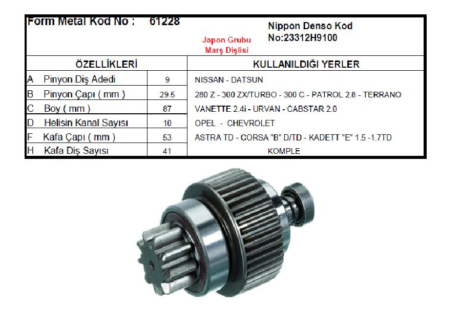 MARŞ DİŞLİSİ 9D HİTACHİ TİPİ >ASTRA-VECTRA/NISSAN VANETTA PATROL 2,8 TERRANO 61228