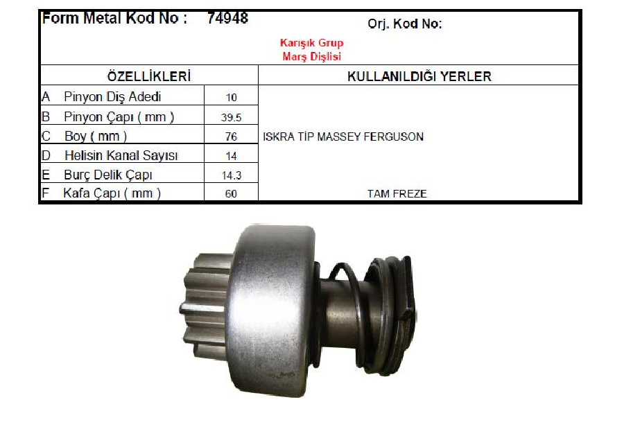 MARŞ DİŞLİSİ 10D 14 KANAL ISKRA TİP MASSEY FERGUSON /PANTOM 3050-3060/PERKİNS MOTOR/ERKUNT TRAKTÖR/HİDROMEK KEPÇE/BEKO LOADER/JCB İŞ MAKİNASI/DAEWOO FORKLİFT 74948
