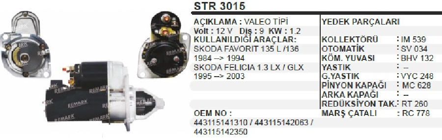 MARS MOTORU 12V 9 DIS 1,2 KW VALEO TIP SKODA FAVORIT 135L 136 84-94 FELICIA 1,3 LX GLX 95-03 TERS DÖ STR3015