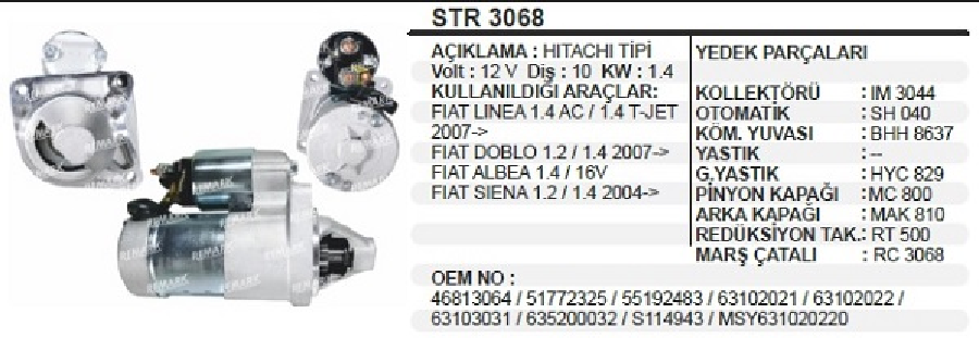 MARŞ MOTORU 12V. HİTACHİ TİPİ 10D 1.4 KW FİAT LİNEA 1,4 AC/1.4T-JET 2007->/DOBLO 1,2/1,4/ALBEA SOLE STR3068