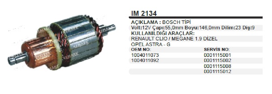 MARŞ KOLL. 12V BOSCH TİPİ RENAULT CLİO MEGANE 1.9 OPEL ASTRA G 23 DİLİM 9 DİŞ ÇAP 55 mm UZUNLUK 146 IM2134
