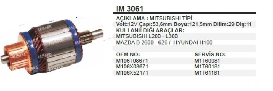 MARŞ KOLL. MITSUBISHI TIPI 12V MITSUBISHI GALANT / LANCER-DODGE- MAZDA-PLYMOUTH-SUBARU BOY:121.5 CA IM3061