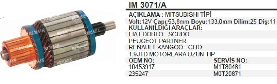 MARŞ KOLL 12V MİT. TİPİ FİAT DOBLO-SCUDO/PEUGEOT PARTNER/RENAULT KANGO-CLİO 1,9 JTD MOTORLARA UZUN T IM3071A