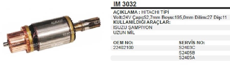 MARŞ KOLL. HITACHI TIPI 24V ISUZU CHAMPION UZUN BOY:195 CAP:52,7 DIS:11 DILIM:27 RULMANSIZ IM3032