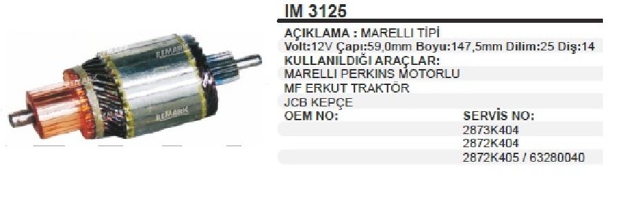 MARŞ KOLL.MARELLİ TİP 12V > ERKUNT TRAKTÖR/JCB İŞ MAKİNASI BOY:147 DIS:14 CAP:59 DILIM:25 IM3125