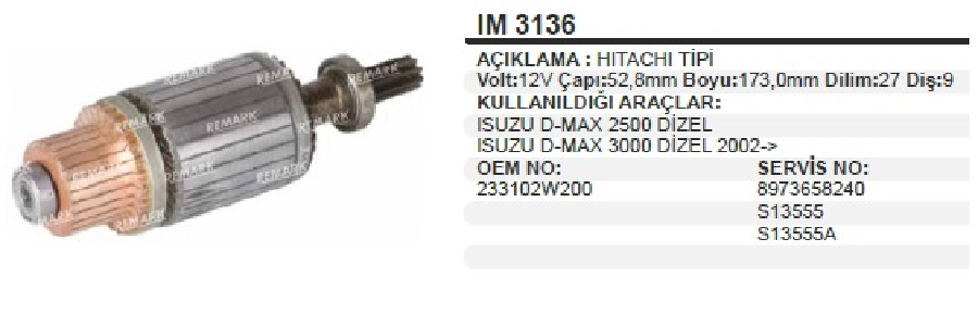 MARŞ KOLL. HITACHI TİP 12V ISUZU D.MAX PICK UP 2.5-3.0 27 DİLİM 9 DİŞ ÇAP 52,80 mm UZUNLUK 173 mm IM IM3136