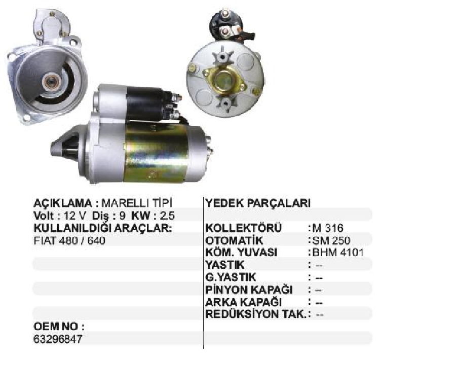MARŞ MOTORU 12V,9D,25 KW>MAKO TİPİ FIAT TRAKTÖR 480-640 YM DEUTZ MOT, CHRYSLER PD 250 DODGE /FARGO DESOTO KAMYON/ MF 3105 TRAKTÖR/SAME TRAKTÖR/VOLVO MAKO-63217126